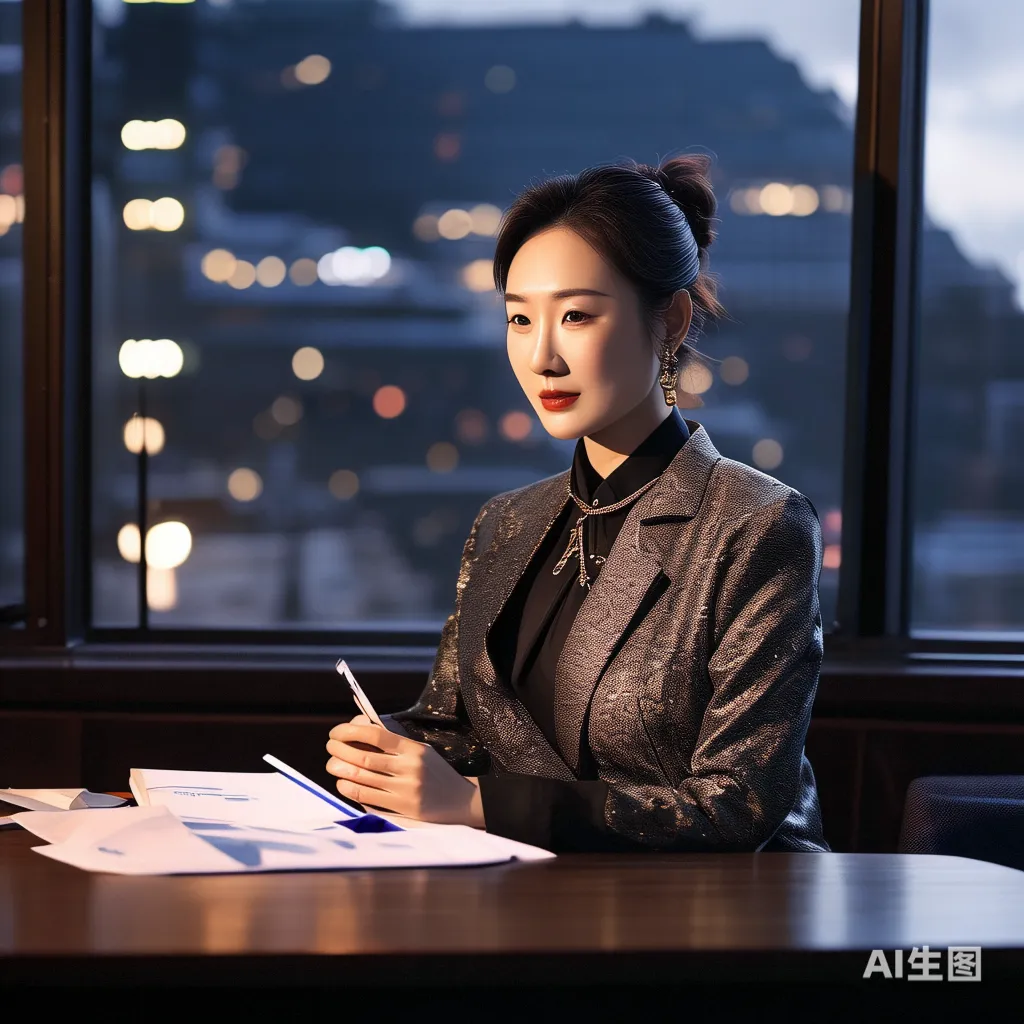 在这张由AI绘制的插图中,我们可以看到秦海璐饰演的角色许梦安,一位互联网公司的高层管理者,正坐在她充满文件的办公桌前,神情凝重且若有所思。窗外,繁忙的城市夜景映衬出她面临的艰难决策——既要保护自己的职业地位,同时也要处理公司裁员的棘手问题,这一切都在她的眼神中得到了深刻的体现。这张图完美地捕捉了《岁月如歌》中所探讨的主题:在生活的压力与挑战面前,人们如何找到自我,保持坚韧,并在逆境中成长。