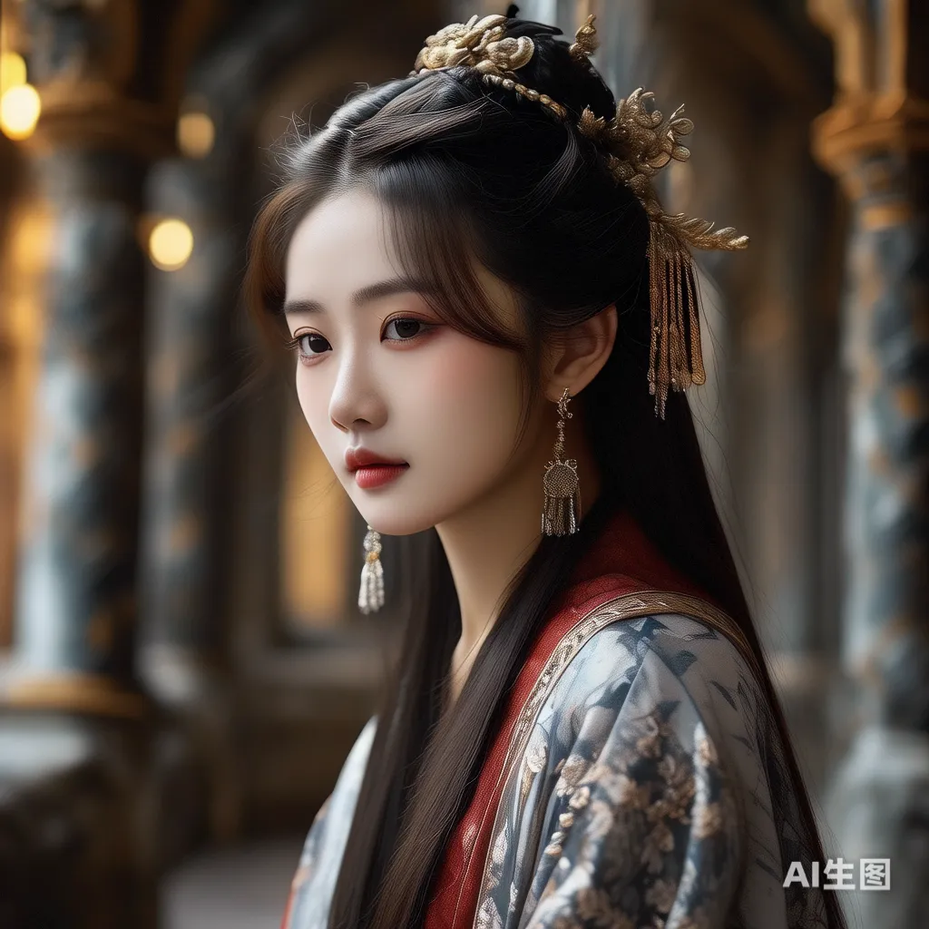 正如上述剖析婉宁长公主的故事, 我们不妨借由一幅插图, 更直观地感受这位女性角色的悲剧色彩。在破败的宫殿背景下, 婉宁的眼神中透露出深沉的哀伤, 周围弥漫着浓厚的悲剧氛围, 这一切都仿佛在诉说着她坎坷的命运。
